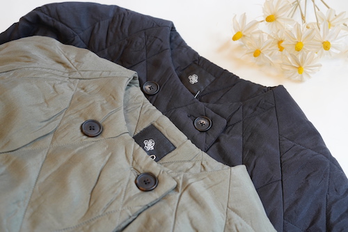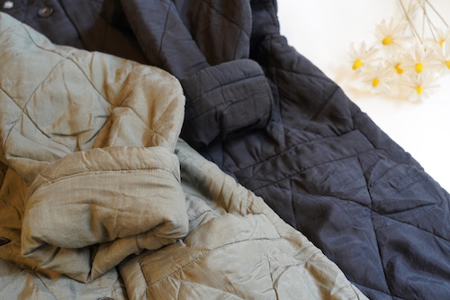 シルク(表地)とコットン(裏地)の間にポリエステル綿を挟みキルティングに仕上げたコートは艶やかでしなやかな風合いが魅力です