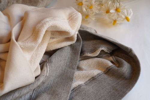 自然の柔らかな色合いはもちろん染色加工を一切行わないことで生地本来の柔らかさも失わず素肌に着ても心地よい肌触りに仕上がっています