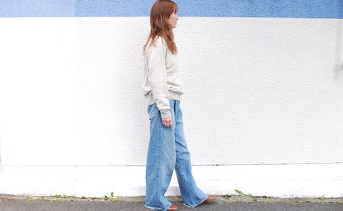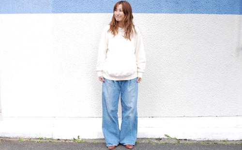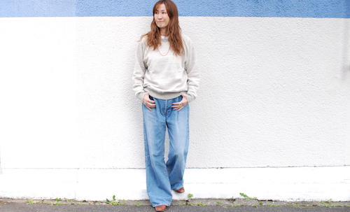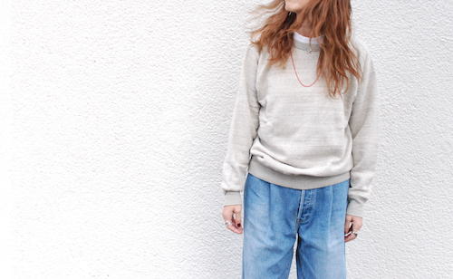 シンプルなデザインのクルーネックスウェットは1枚持っていると万能です
