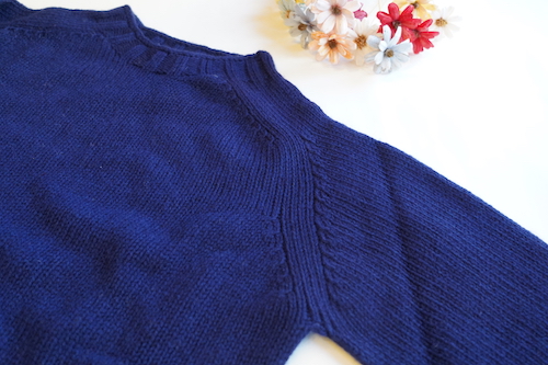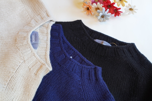ラグランスリーブの肩の部分が帯状になっているのが特徴のサドルショルダーとホールガーメントを用いた脇下や袖下に継ぎ目がないシームレス仕様で立体的に編み上げているのでゴワつきも少なく程よくフィット感があります