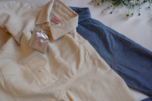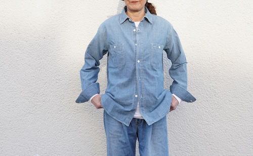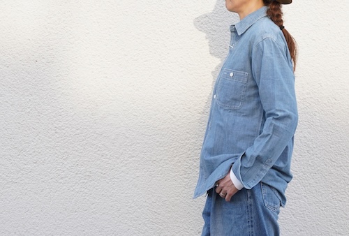 吸湿、保温性、通気性に優れ3本針、脇マチ、ネコ目ボタンとヴィンテージワークシャツのディテールを忠実に再現したシャンブレーシャツ