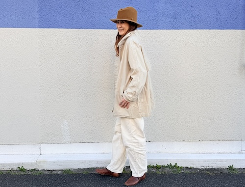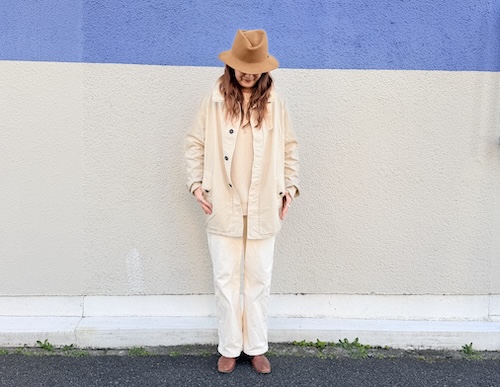 製品染を施すことで生じる独特の表情やシーム部分のパッカリングがワークウェアのような風合いに仕上がっています